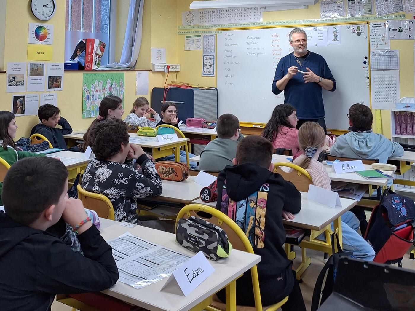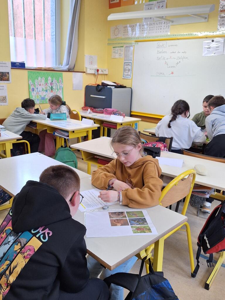 Un second atelier d’écriture a pu se tenir, les élèves ont travaillé par binômes à l’écriture d’un passage de l’histoire qui leur a été confié. C’était l’occasion pour l’auteur de distiller des mots de vocabulaire et procédés propres à l’écriture : trame, inclusion d’un narrateur omniscient, de dialogues, d’éléments perturbateurs…