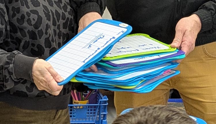 Il s’agissait du troisième atelier d’écriture, les élèves ont repris les passages de l’histoire qu’ils avaient commencé à écrire, ils ont également réfléchi ensemble aux paroles d’une comptine qu’ils pourraient insérer à l’histoire. Eric Simard les a ensuite fait travailler sur les couleurs et les émotions, en leur proposant d’écrire de courts poèmes/phrases leur permettant d’exprimer ce à quoi la couleur rouge et le noir pouvaient leur faire penser (ils continueront l’exercice avec la couleur bleue en classe). Cela a ensuite donné lieu à la restitution spontanée (avec une lecture à voix haute par certains élèves, Eric Simard ou Vanessa Cailleau -l’enseignante-) des extraits rédigés par les élèves. Eric Simard a également dédicacé le livre Kaïg qu’ils avaient tous reçu en cadeau (par l’Ecole) à Noël.