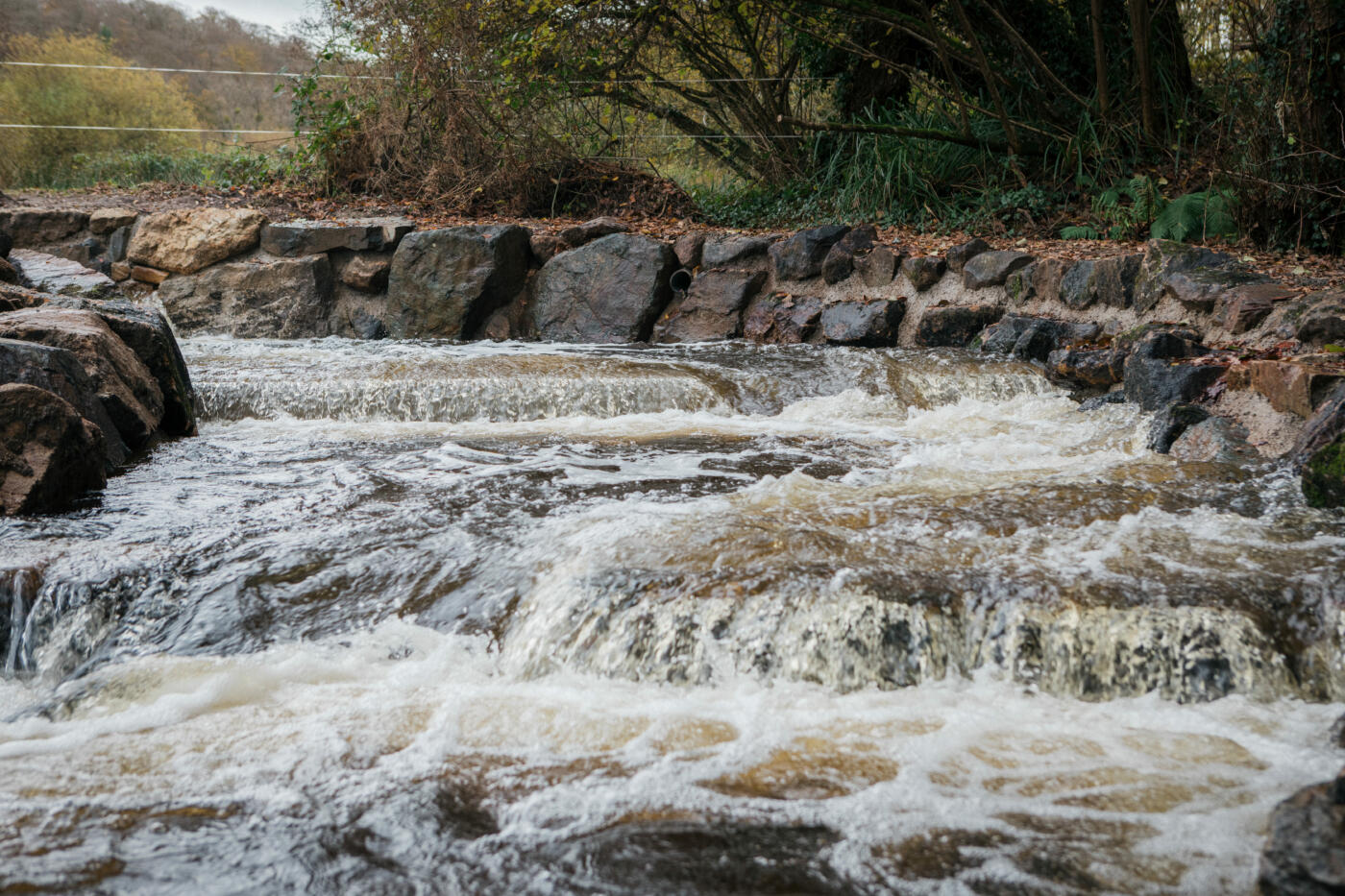 Cette configuration divise la chute d’eau initiale de 1,20 m en petites marches franchissables par les poissons migrateurs qui alternent vie en mer et en rivière pour accomplir leur cycle biologique.