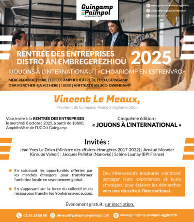 Guingamp-Paimpol Agglomération donne rendez-vous aux entreprises du territoire le mercredi 8 octobre 2025 de 18h à 20h30 pour un temps de témoignage et d’échanges sur le thème « JOUONS À L’INTERNATIONAL « ! L’occasion pour les acteurs de l’économie du territoire de penser ensemble de nouvelles possibilités et opportunités tournées vers l’échelle internationale lors d’un temps d’échange et de partage, propice au développement de réseaux professionnels.