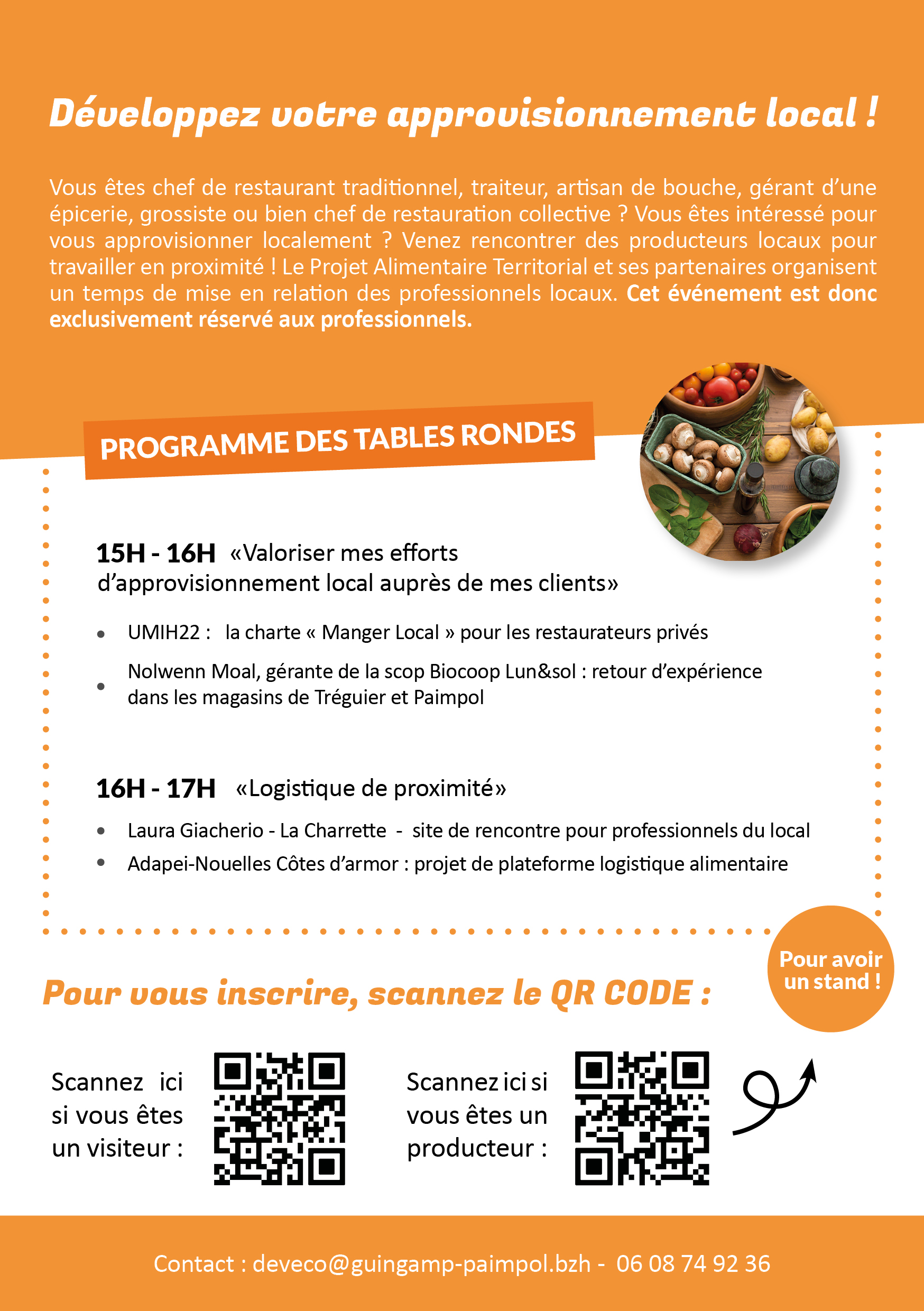 Le lundi 13 octobre 2025, de 14 h 00 à 18 h 00, à la salle des fêtes de Paimpol, les restaurateurs, traiteurs, artisans des métiers de bouche, hôteliers, distributeurs ou gestionnaires de restauration collective sont invités à rencontrer les producteurs locaux du territoire lors d’un événement professionnel dédié au développement des circuits courts et des approvisionnements de proximité.