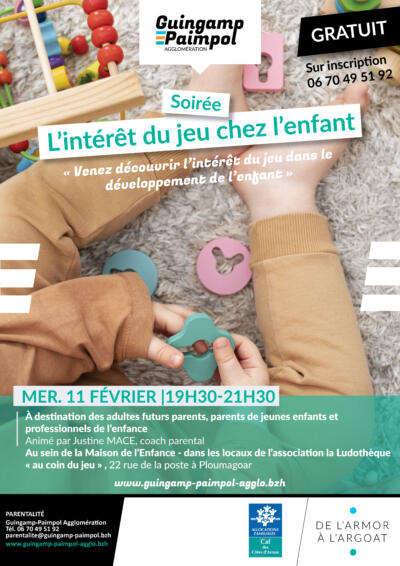 Mercredi 11 février de 19h30 à 21h30 venez découvrir l’intérêt du jeu dans le développement de l’enfant. À destination des adultes futurs parents/parents et professionnels de l’enfance. Animé par Justine MACE, coach parental. Au sein de la Maison de l’Enfance, dans les locaux de l’Association à la Ludothèque « au coin du jeu », 22 rue de la poste à Ploumagoar.